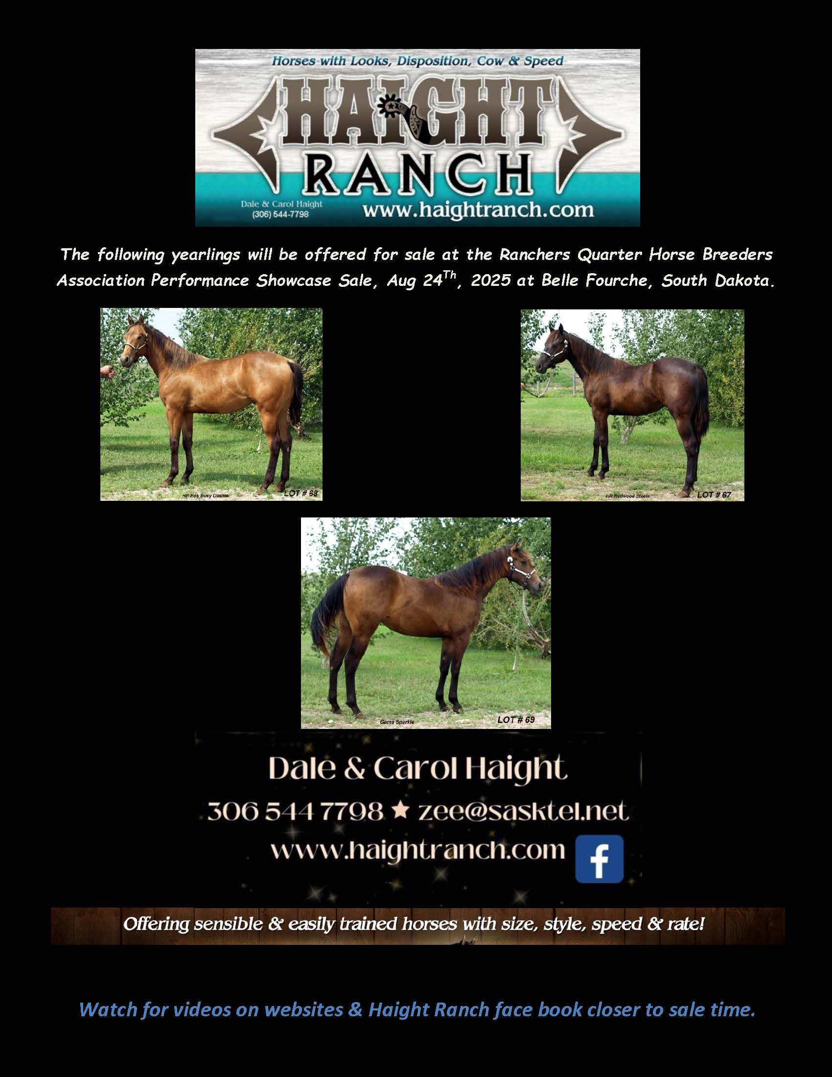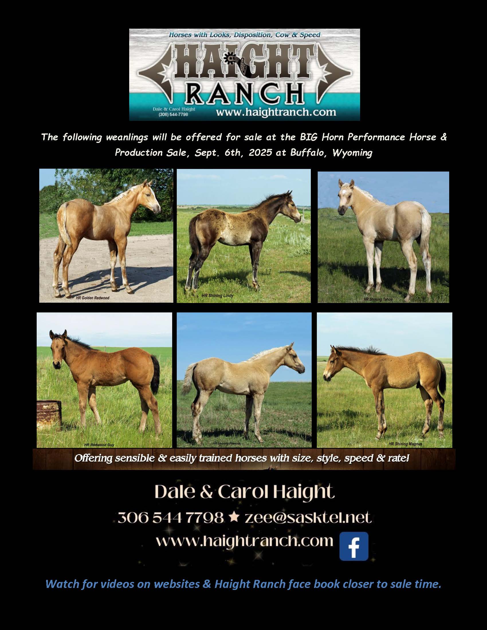 for photos & info. Coggins tested. USA Vet. inspected. Watch for a video closer to sale time at www.haightranch.com or face book under Haight Ranch. Please call 306 544 7798 for info
